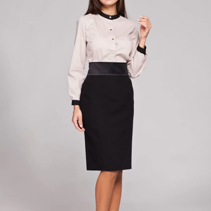Ein klassischer Bleistiftrock. Zurück mit Reißverschluss, eine tiefe Fliege befestigt. Taille betont, Satinband.