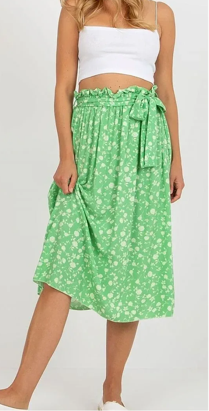 Ausgestellter Rock aus geblümtem Stoff. Der Rock hat ein Band in der Taille.