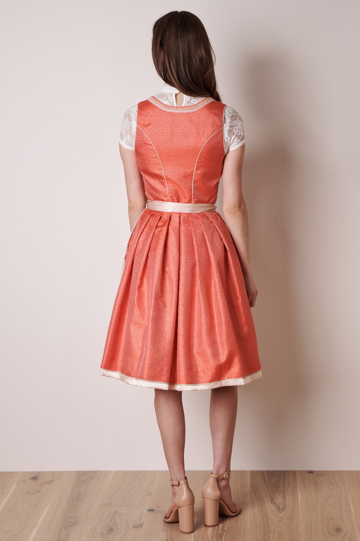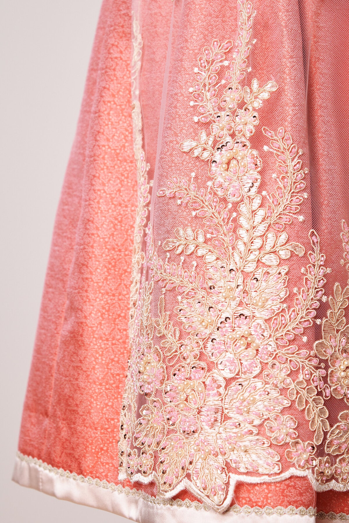 Das Dirndl Darcy kommt mit einer feinen Tüllschürze daher. Diese ist mit floralen Stickereien und Perlen verziert. Die Perlen finden sich auch in den glitzernen Miederhaken wieder.