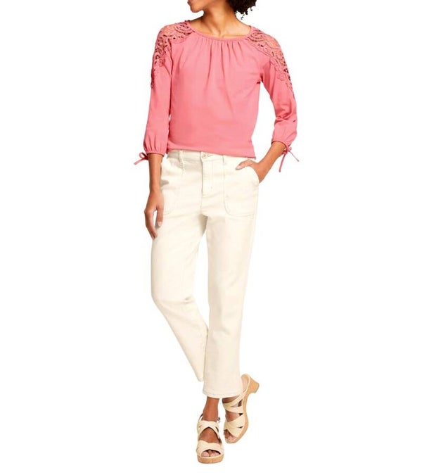 Sweet und easy – so lieben wir stylishe Basics. Feminin verspieltes Shirt mit dekorativem Stickerei-Spitzeneinsatz an Schulter und Arm. Weite, ¾-lange Ärmel mit Schlitz und Bindebändchen am Abschluß. Runder Ausschnitt mit Blende, Darunter in kleine Falten gelegt. Figurumspielend. Länge ca. 66 cm. Hochwertiger Jersey aus 95% Baumwolle/5% Elasthan. Spitze aus 100% Polyester.