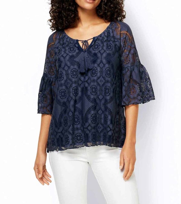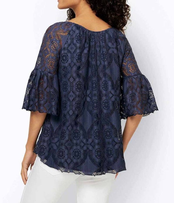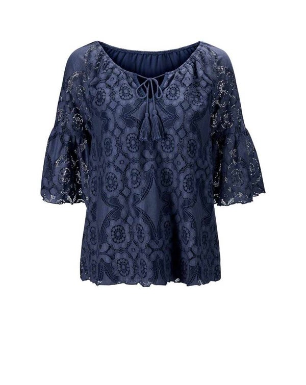 Ein zeitloses Modell, das sich variantenreich kombinieren lässt. Understatement pur - ausgefallen und edel. Legeres Shirt aus Allover-Stickerei-Spitze. Mit leicht transparenten Partien und Volants. Blickdichtes Jerseyfutter am Body. ½-lange Ärmel mit üppigem Volantabschluß. Elastischer Rundhals mit V und Bindebändern mit Zierquasten. Lockerer Sitz. Länge ca. 66 cm. Spitze aus 70% Baumwolle/ 30% Polyamid. Jersey aus 95% Viskose/ 5% Elasthan.