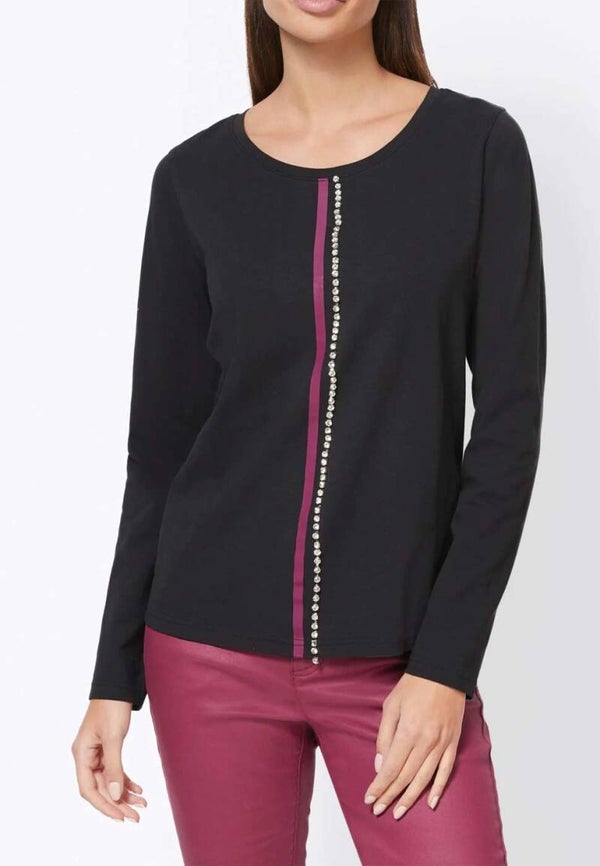 Rücksichtslos extravagant - kompromißlos raffiniert - mit aufwendigem, funkelndem Strasssteinchen-Besatz auf dem Vorderteil. Figurumspielende Form mit Rundhalsausschnitt und Langarm. Kontrastpaspel. Länge ca. 62 cm. Hochwertiger Jersey aus 95% Baumwolle/ 5% Elasthan.