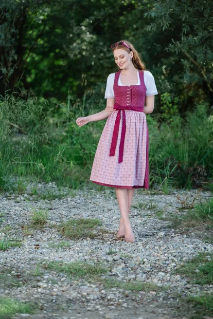 Das Dirndl Louisa hat einige Design-Highlights zu bieten. Die Kontrastpaspel und die farbilich passenden Knöpfe runden das Leinenoberteil ab. Der Baumwollrock mit dem Taftschürzenband und die weißbödige Schürze mit Blumen in Rosa-Tönen gefallen besonders gut.